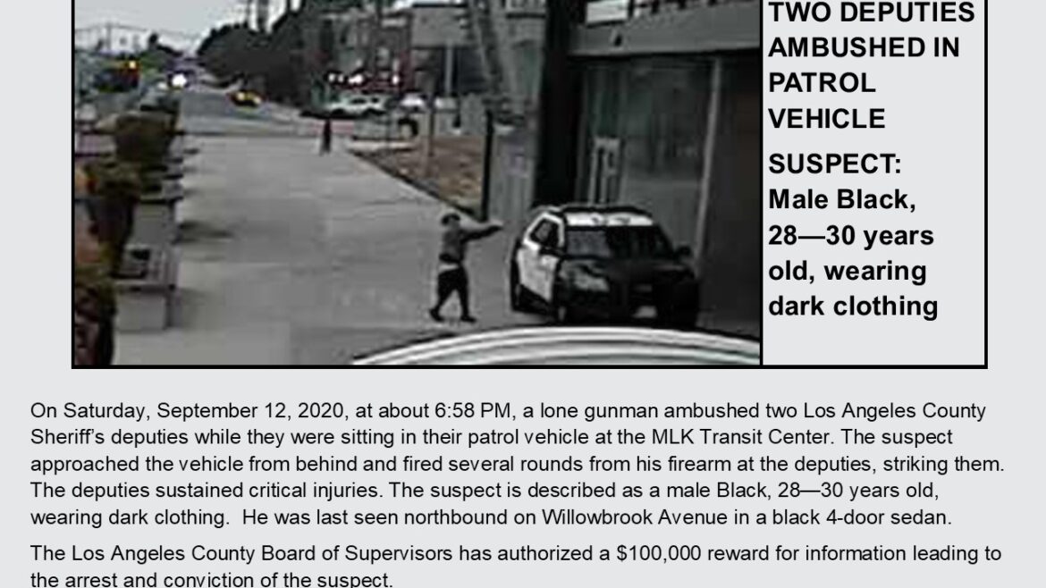 Los Angeles County Sheriff’s Homicide investigators are continuing to investigate the circumstances surrounding the shooting of two LASD deputies. The incident was reported Saturday, September 12, 2020, at approximately 6:58 p.m., at the MLK Transit Center in Compton.