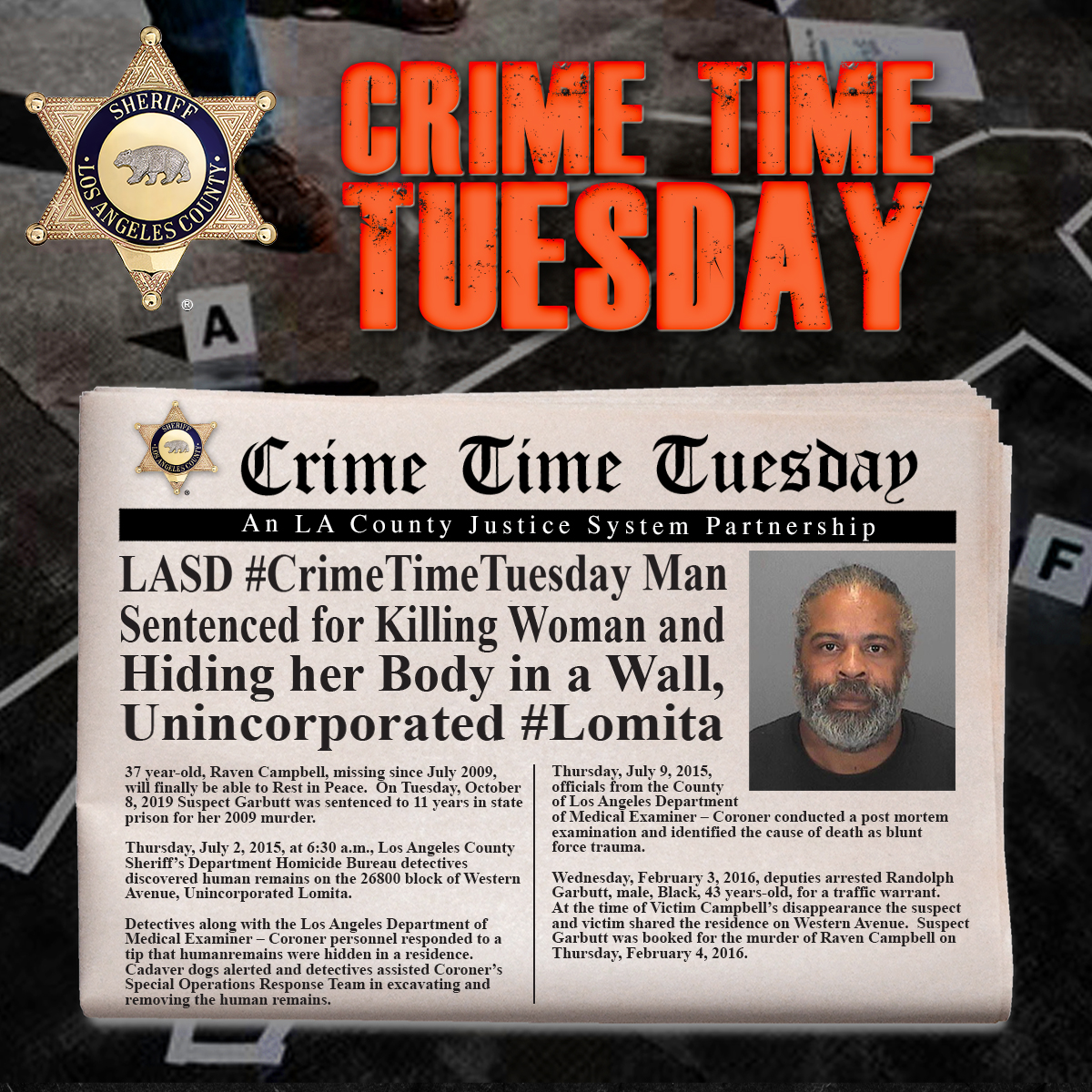 #LASD #CrimeTimeTuesday Man Sentenced for Killing Woman and Hiding her Body in a Wall, Unincorporated #Lomita 37 year-old, Raven Campbell, missing since July 2009, will finally be able to Rest in Peace. On Tuesday, October 8, 2019 Suspect Garbutt was sentenced to 11 years in state prison for her 2009 murder. Thursday, July 2, 2015, at 6:30 a.m., Los Angeles County Sheriff’s Department Homicide Bureau detectives discovered human remains on the 26800 block of Western Avenue, Unincorporated Lomita. Detectives along with the Los Angeles Department of Medical Examiner – Coroner personnel responded to a tip that human remains were hidden in a residence. Cadaver dogs alerted and detectives assisted Coroner’s Special Operations Response Team in excavating and removing the human remains. Thursday, July 9, 2015, officials from the County of Los Angeles Department of Medical Examiner – Coroner conducted a post mortem examination and identified the cause of death as blunt force trauma. Wednesday, February 3, 2016, deputies arrested Randolph Garbutt, male, Black, 43 years-old, for a traffic warrant. At the time of Victim Campbell’s disappearance the suspect and victim shared the residence on Western Avenue. Suspect Garbutt was booked for the murder of Raven Campbell on Thursday, February 4, 2016. Link to press conference re: http://bit.ly/2Mjgrqz
